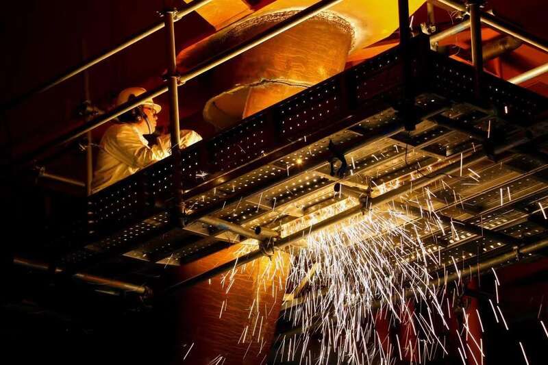 施工人员有序切割组块与船舶之间的固定连接,为浮托作业的载荷转移提供保障。